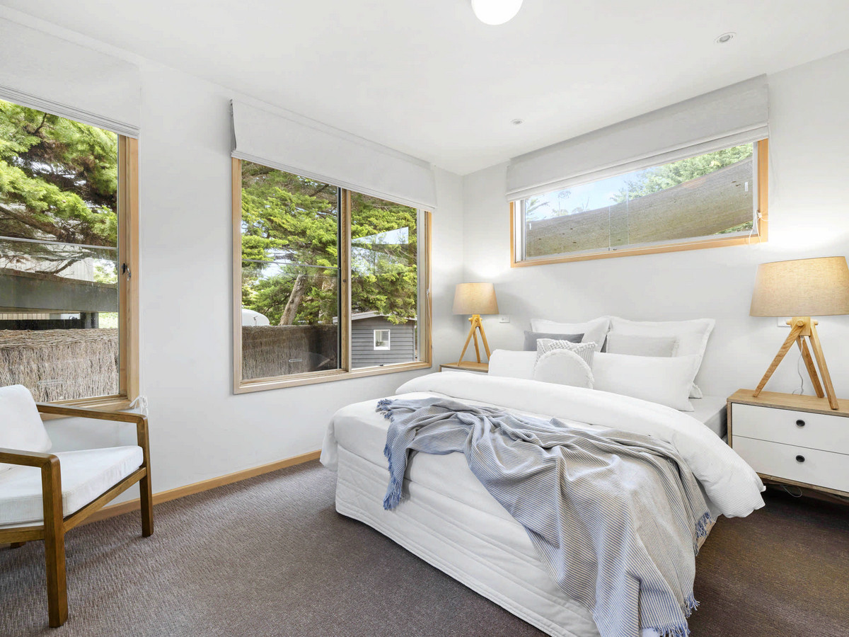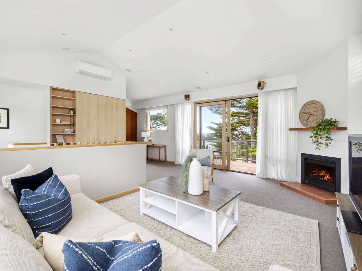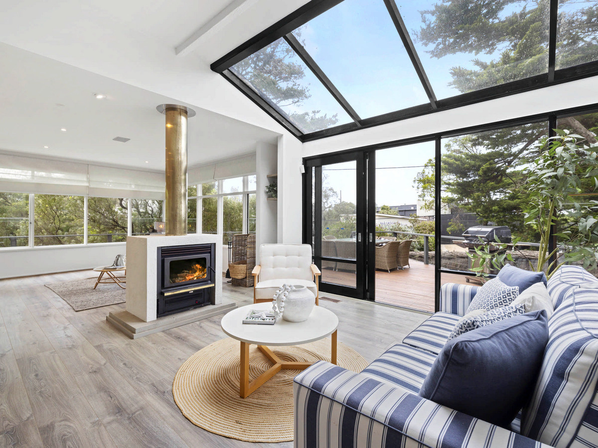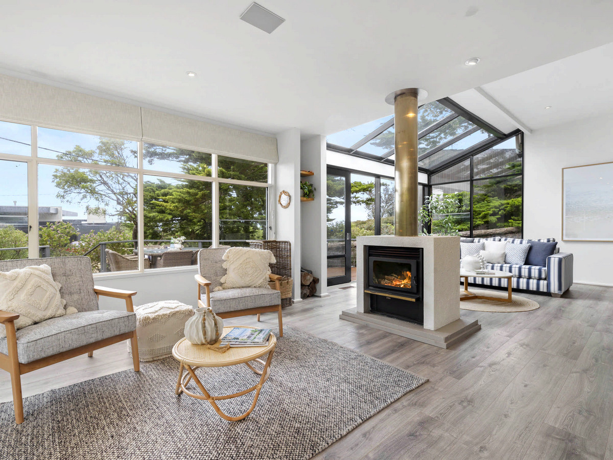 At the heart of this home is a stylish double-sided fireplace, serving as the centrepiece for the living, dining, and sitting areas. All seamlessly flowing to the beachside alfresco deck, offering the perfect spot to savour the last golden rays of summer sun as they set over the bay.