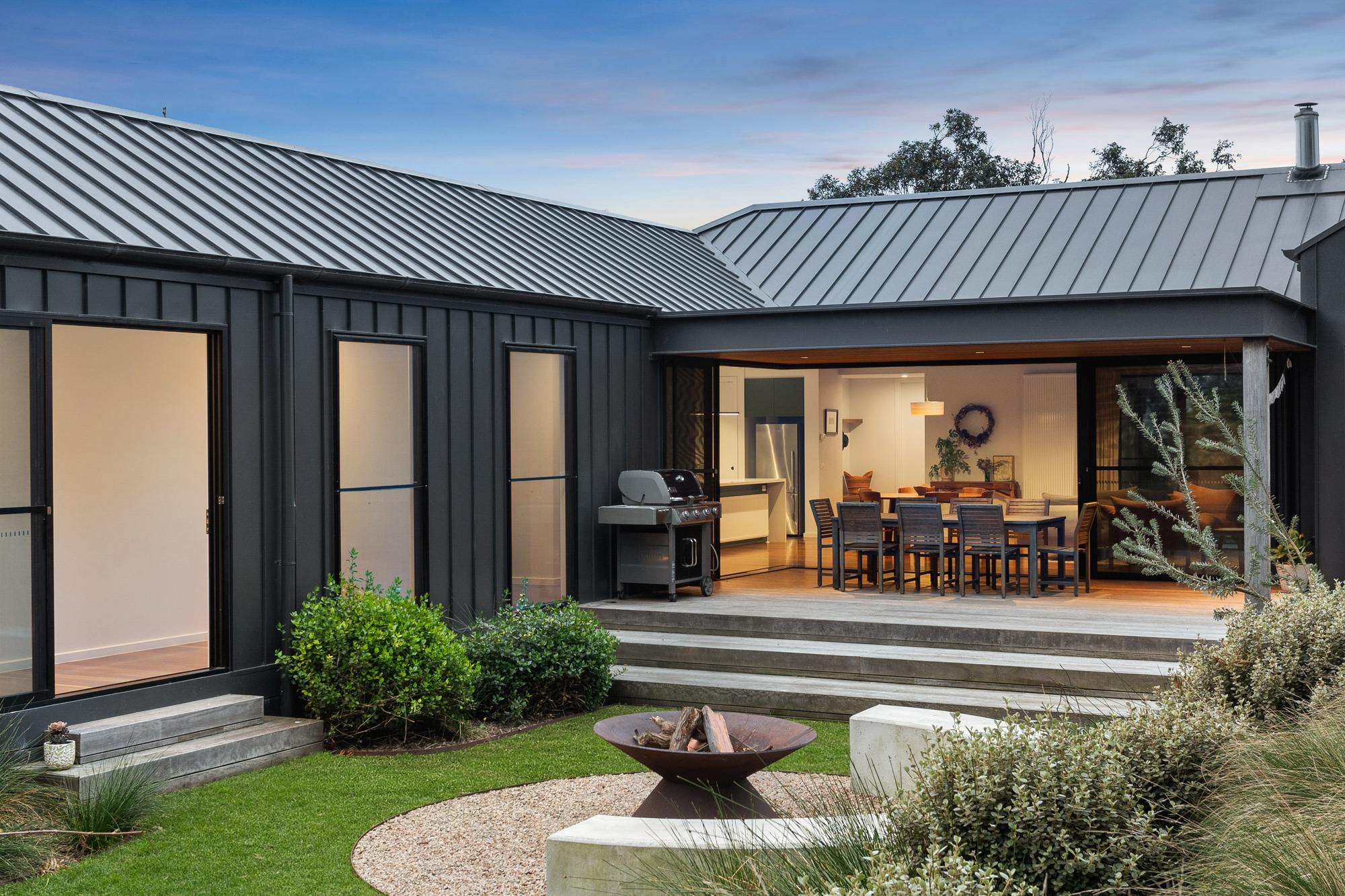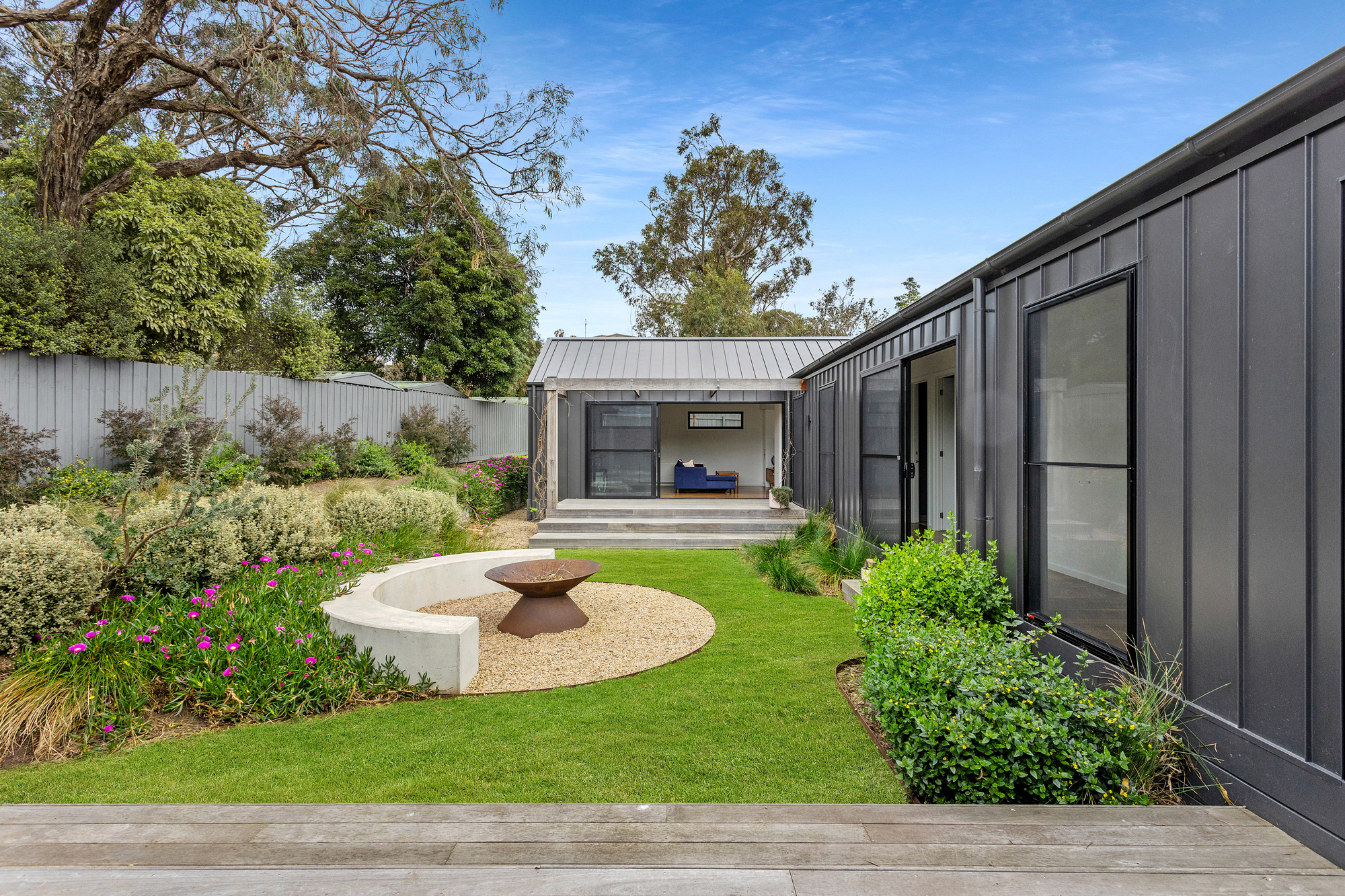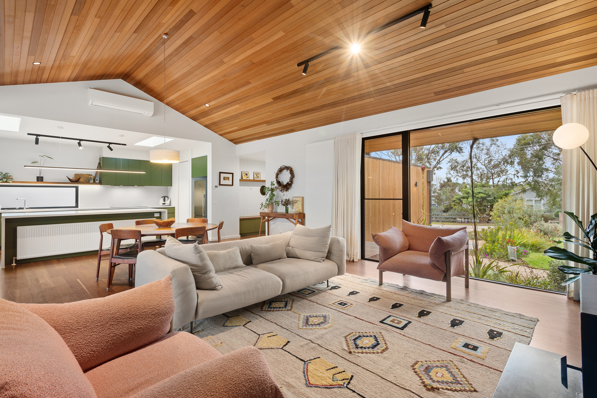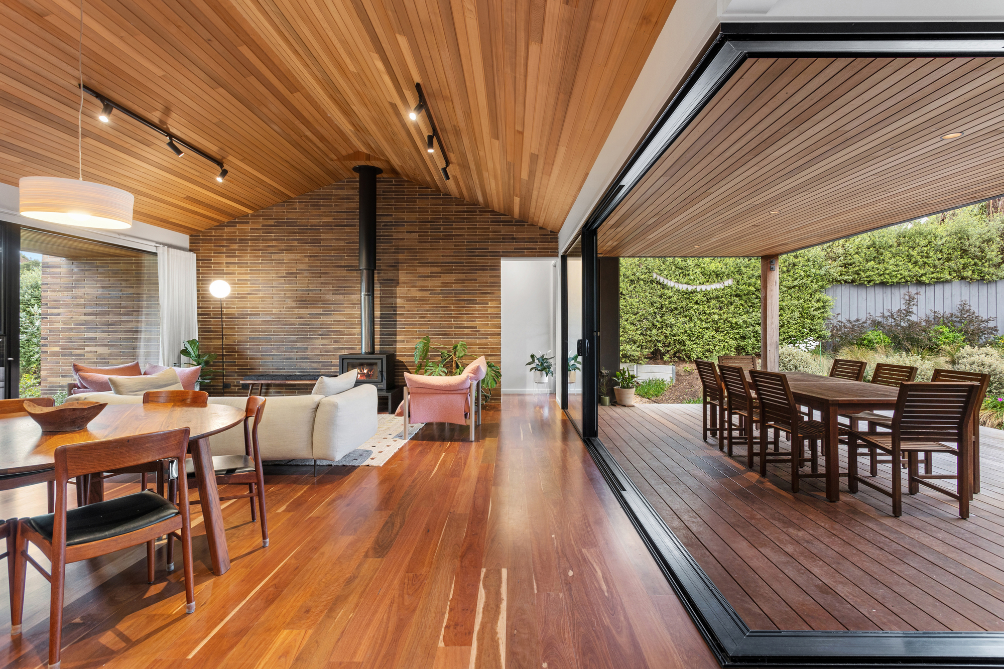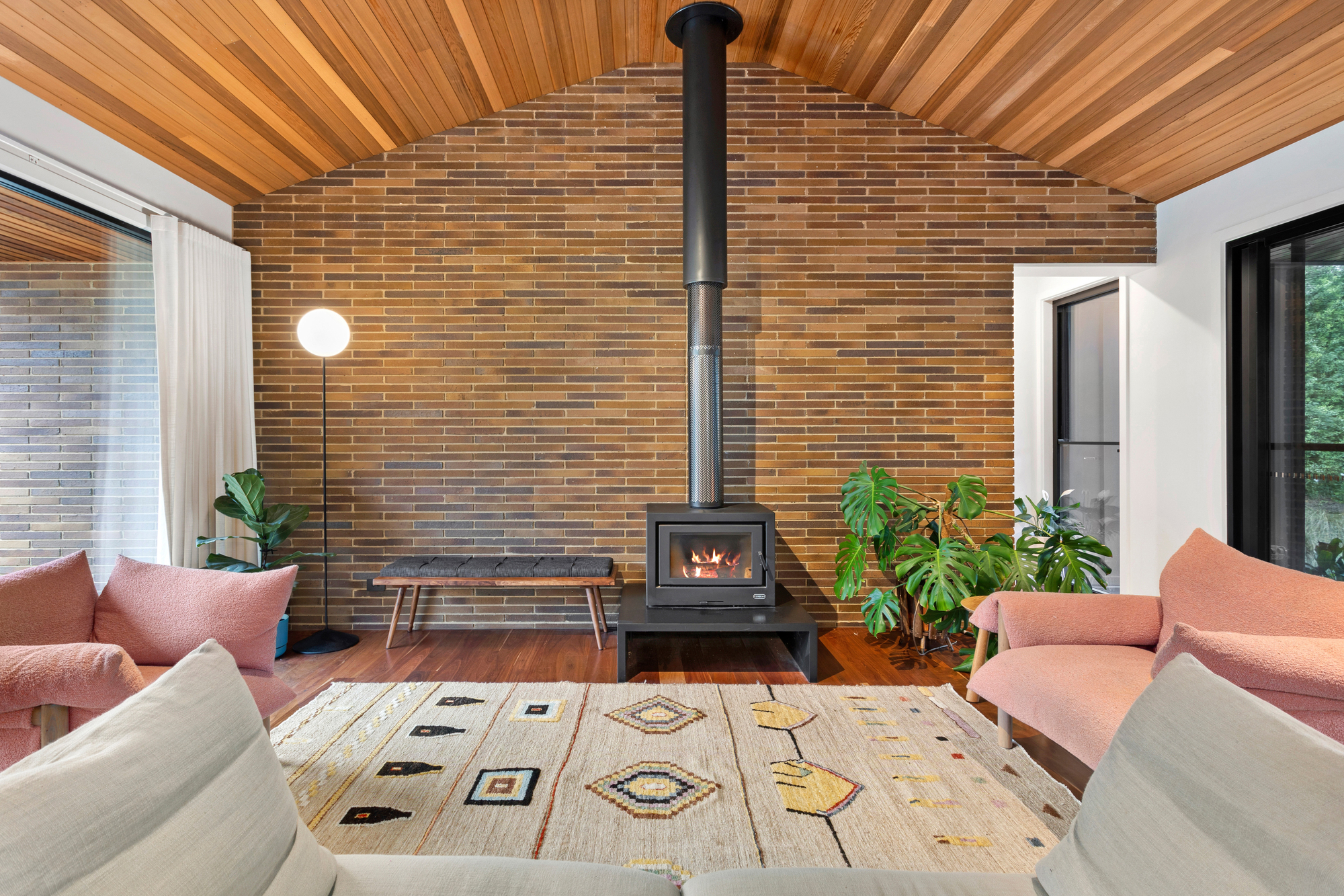 At the heart of the home, soaring cedar-lined ceilings and striking timber floors define the open-plan living zone, anchored by Krause bricks and a slow-combustion fireplace. Oversized double-glazed sliding doors dissolve the boundary between inside and out, revealing a private alfresco dining space, fire pit, and gourmet kitchen. Designed for both style and functionality, the kitchen boasts two Neff ovens, an integrated dishwasher, an induction cooktop, a butler’s pantry, and sleek stone benchtops, making it an entertainer’s haven with a bold aesthetic that pays homage to the home’s native surroundings and subtle mid-century influences.