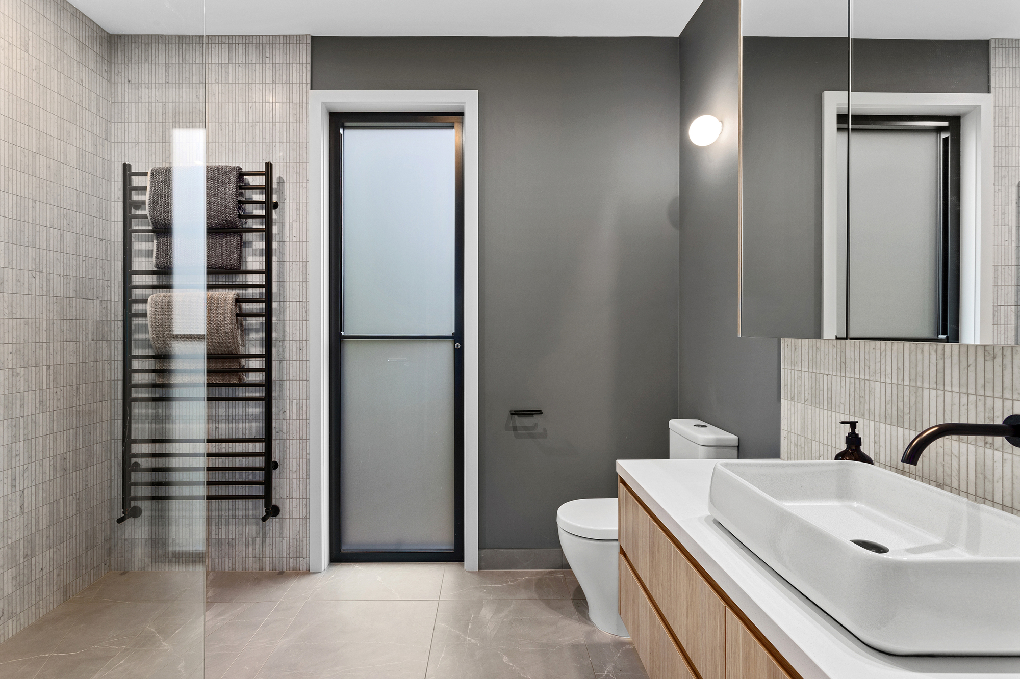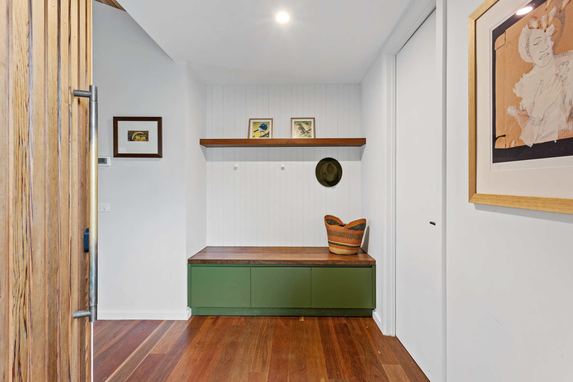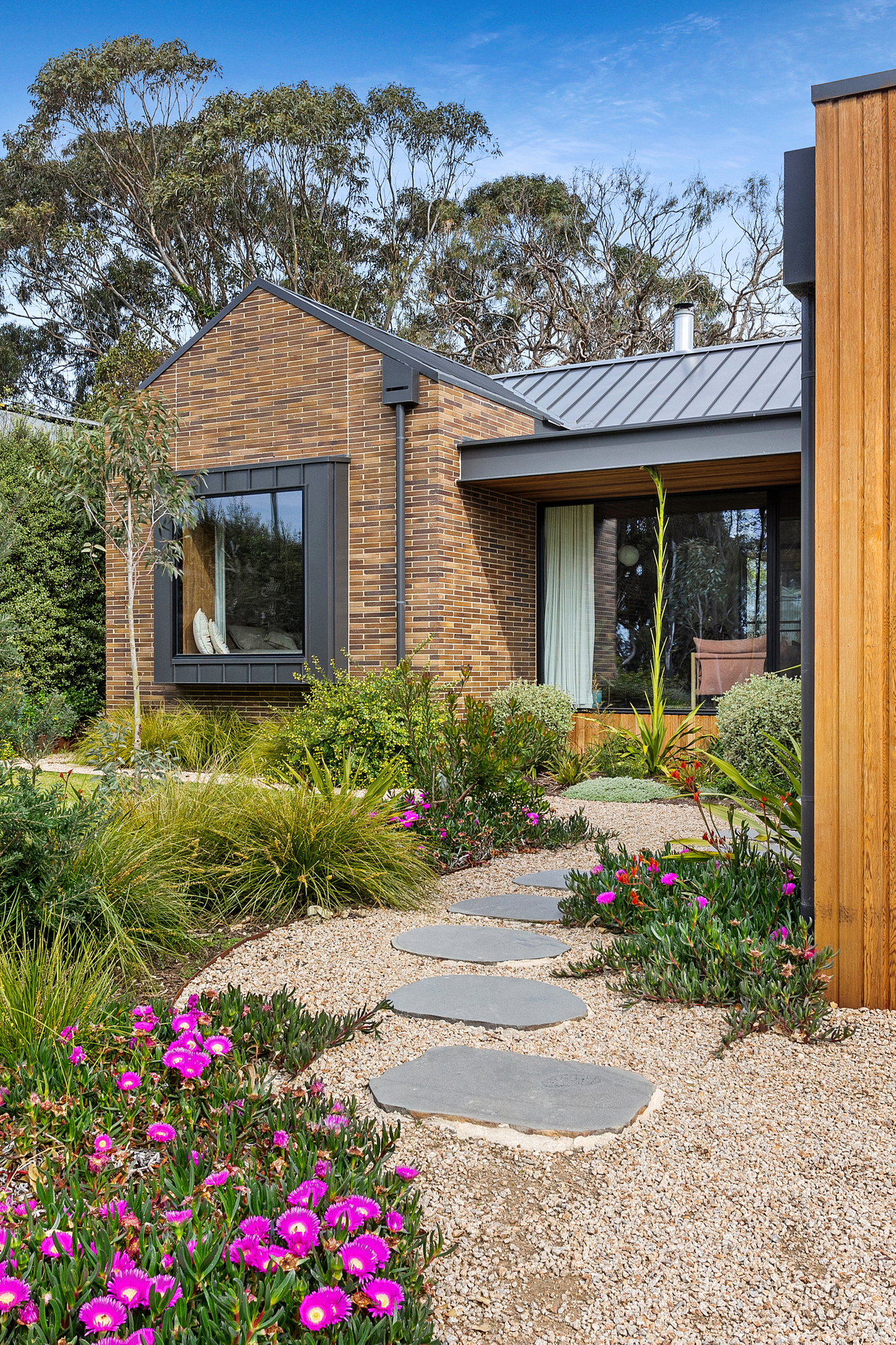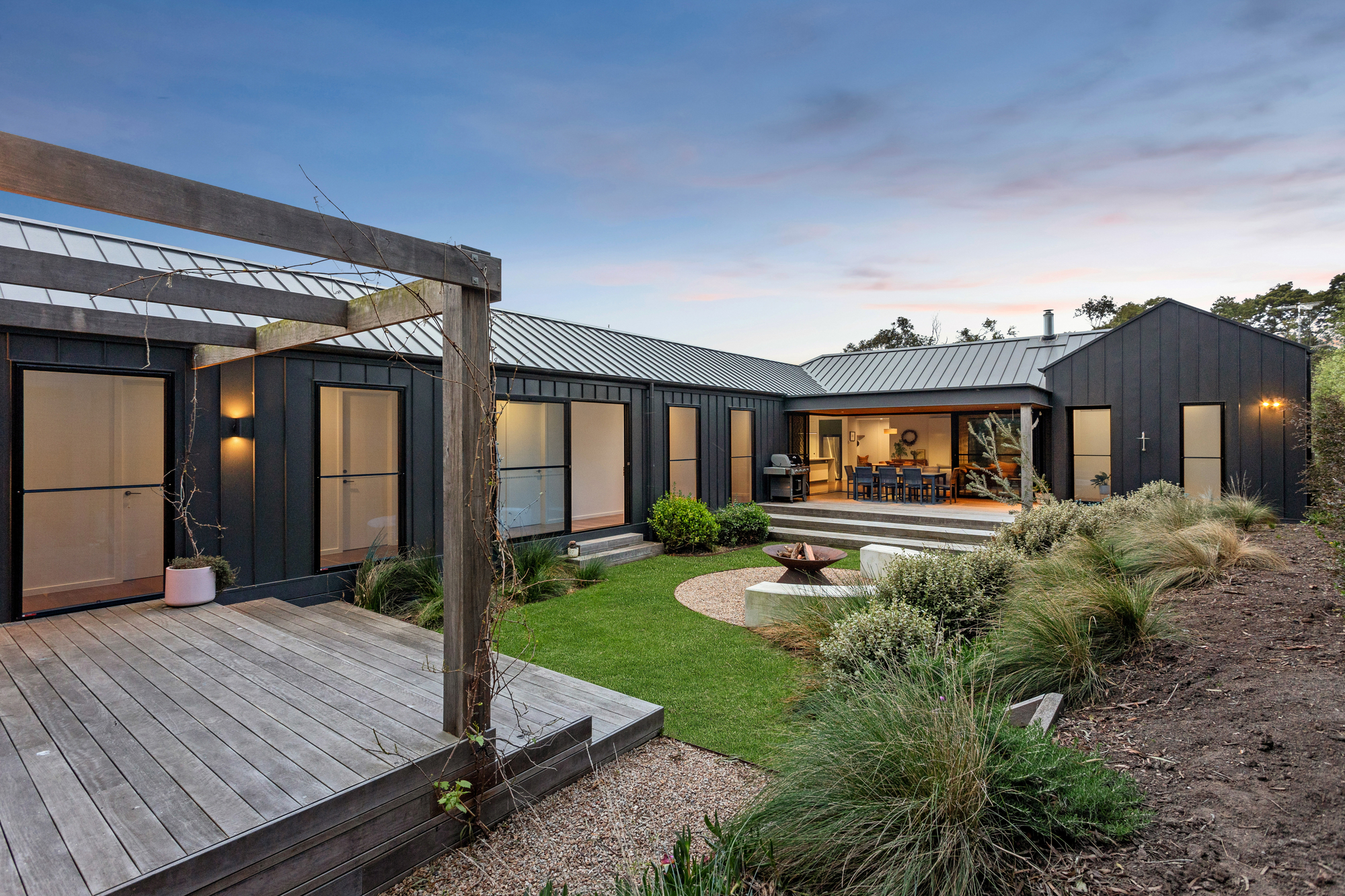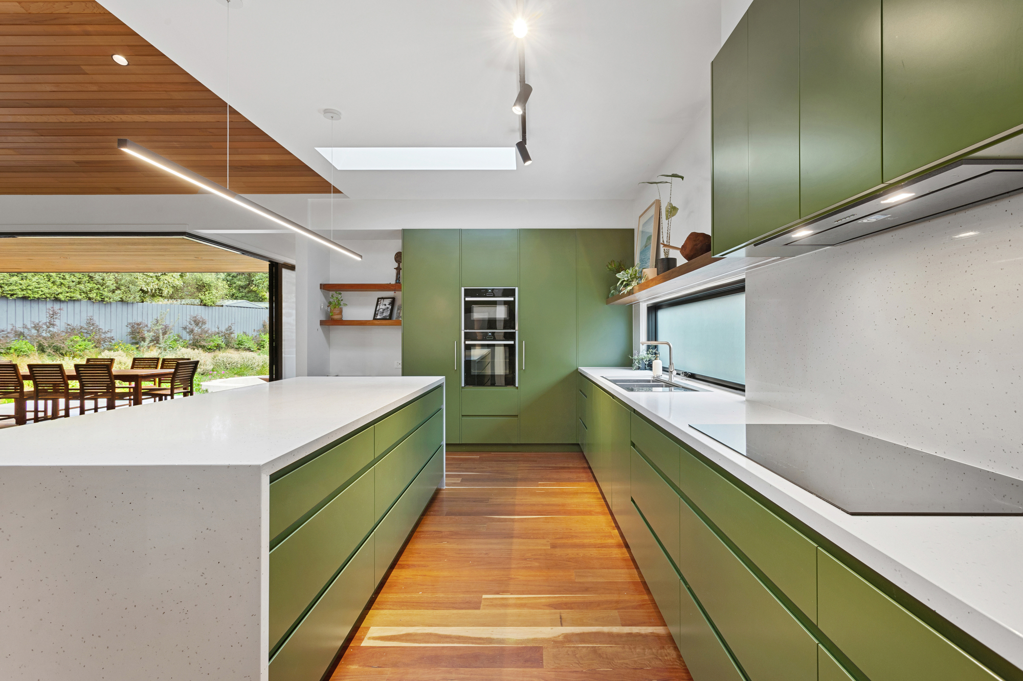 At the heart of the home, soaring cedar-lined ceilings and striking timber floors define the open-plan living zone, anchored by Krause bricks and a slow-combustion fireplace. Oversized double-glazed sliding doors dissolve the boundary between inside and out, revealing a private alfresco dining space, fire pit, and gourmet kitchen. Designed for both style and functionality, the kitchen boasts two Neff ovens, an integrated dishwasher, an induction cooktop, a butler’s pantry, and sleek stone benchtops, making it an entertainer’s haven with a bold aesthetic that pays homage to the home’s native surroundings and subtle mid-century influences.